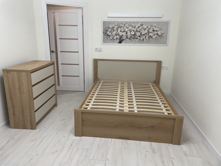 Ta sypialnia pokazuje prostą i spokojną aranżację wnętrza w mieszkaniu. Jasne ściany, jasna podłoga oraz naturalny kolor mebli sprawiają, że pomieszczenie wygląda lekko i przestronnie. Takie rozwiązanie często stosuje się w nowych mieszkaniach, gdzie ważna jest funkcjonalność, wygoda oraz neutralny styl, który łatwo dopasować do różnych dodatków.